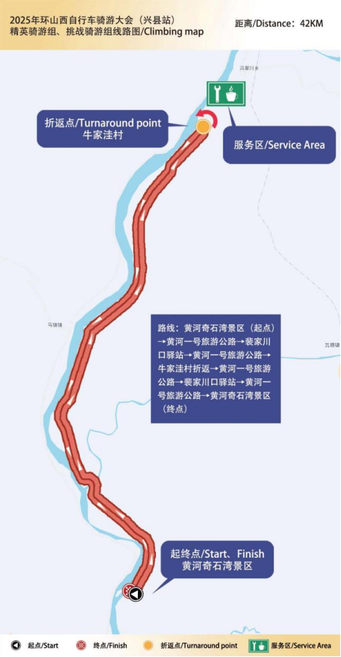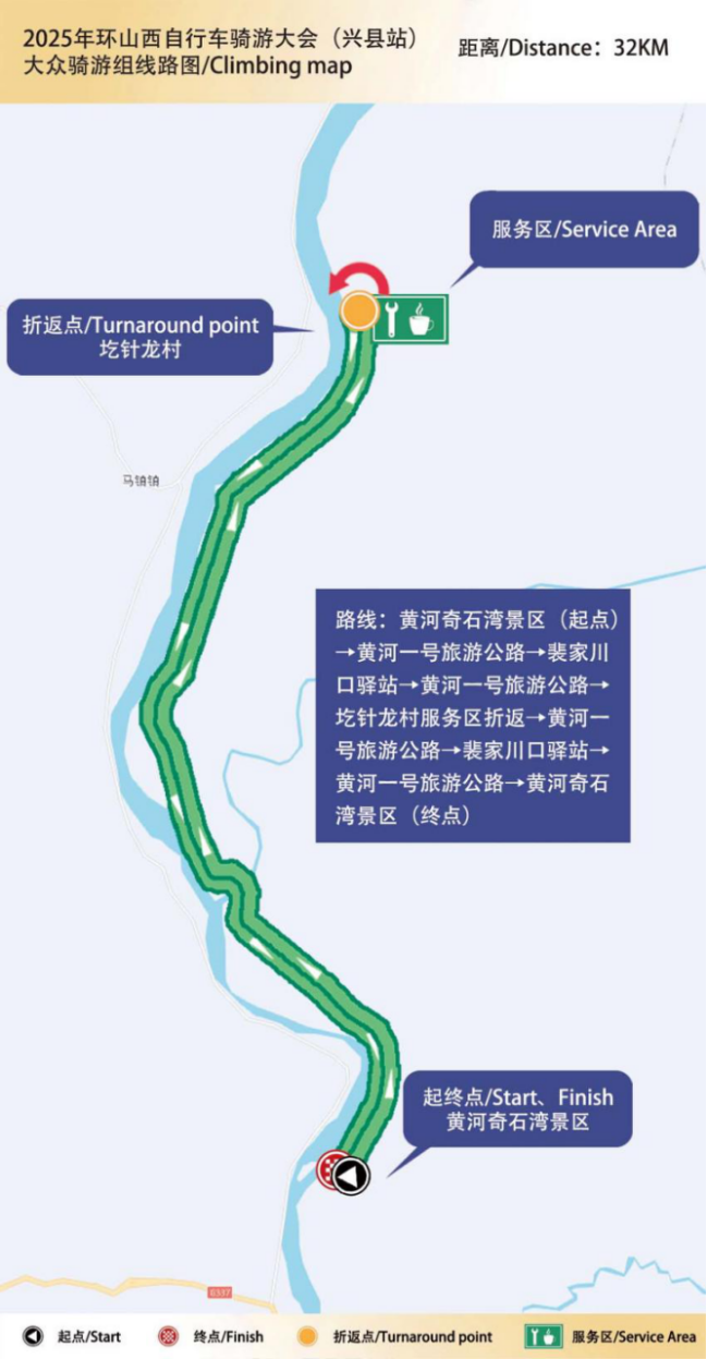 本次赛事由山西省体育局、山西省文化和旅游厅、山西省交通运输厅、山西省广播电视局、吕梁市人民政府主办,山西省自行车击剑球类运动中心、山西省自行车运动协会指导,吕梁市体育局、兴县人民政府承办,兴县教育体育局、兴县文化和旅游局、兴县交通运输局、兴县融媒体中心、各相关部门等协办。共分为精英骑游组(全程42公里)、挑战骑游组(全程42公里)及大众骑游组(全程32公里)3个组别。其比赛路线具体安排如下: