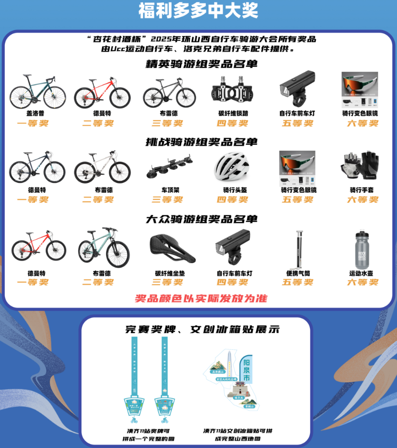 骑行,是一种生活态度,是对未知的探索,是对自我的超越。在这场自行车赛事中,你将与志同道合的伙伴一同追逐梦想,挑战极限。让我们用车轮丈量大地,用汗水书写传奇,在阳泉郊区站留下精彩瞬间。“杏花村酒杯”2025年环山西自行车骑游大会(阳泉郊区站)期待您的加入!
