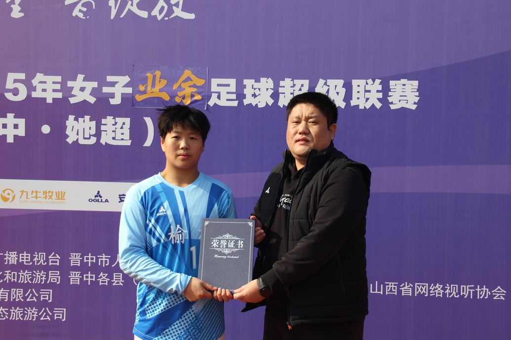 其中,榆社云竹湖队的8号门将李馨怡表现尤为亮眼,成为全场焦点。比赛中,她始终保持高度专注,牢牢守住球队最后一道防线。面对祁县乔家队多次极具威胁的射门,无论是近距离的劲射还是角度刁钻的远射,李馨怡都凭借敏锐的预判、迅捷的反应与稳健的扑救一一化解,多次化险为夷,用扎实的技术和顽强的斗志为球队守住平局。凭借在门将位置上的高光表现与关键贡献,李馨怡被评为本场比赛最佳球员,由比赛监督为其颁发荣誉,这也是对她全力以赴守护球门的最好认可。