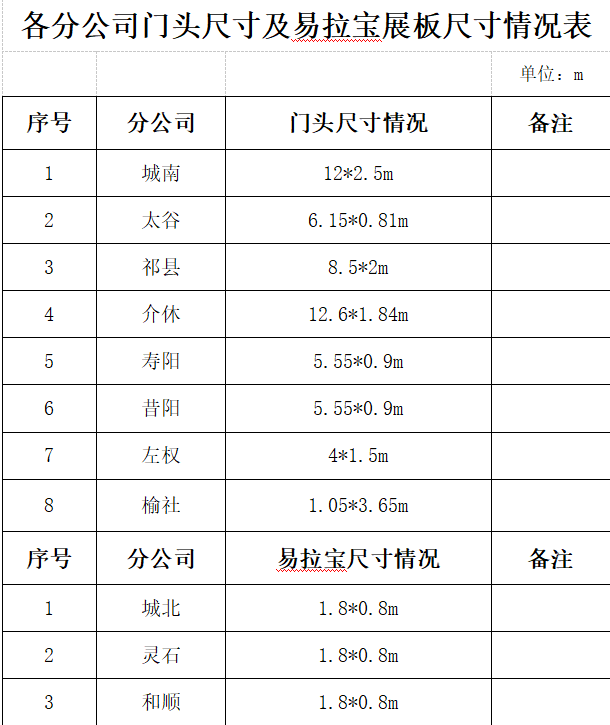 附:《各分公司需要更换门头尺寸及易拉宝展板尺寸情况表》